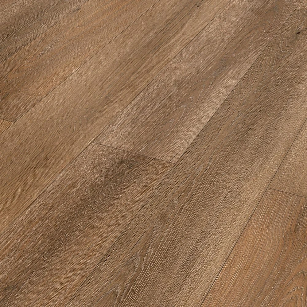 Medium brown laminate flooring with authentic wood texture