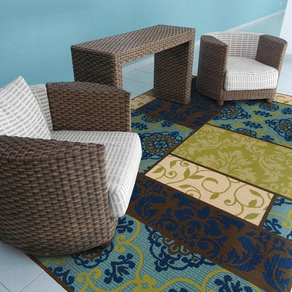Piccadilly is a striking new indoor/outdoor rug in trend-forward shades of indigo and Mediterranean blue and bright lime green. Simple, sophisticated pattern that comes alive with tons of texture and pops of bright color. It is a high-style, highly durable rug that is perfect for the outdoors or for any room in the home.